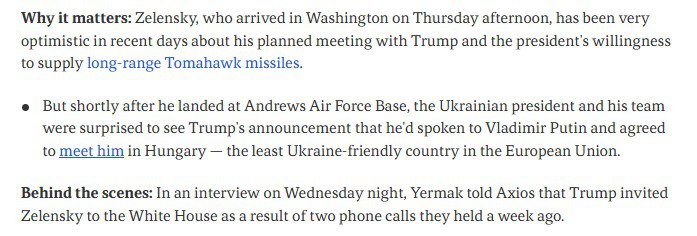 Axios: ‘Зеленский и его команда были удивлены, увидев заявление Трампа о том, что он переговорил с Владимиром Путиным и согласился встретиться с ним в Венгрии — наименее дружественной по отношению к Украине стране в Европейском Союзе’.