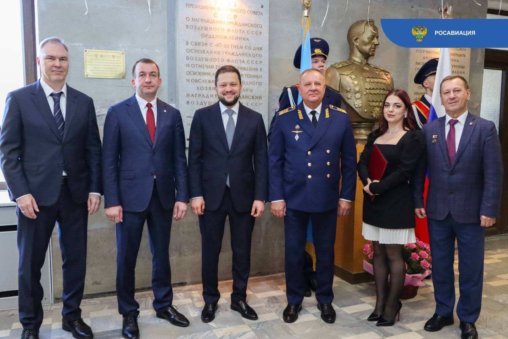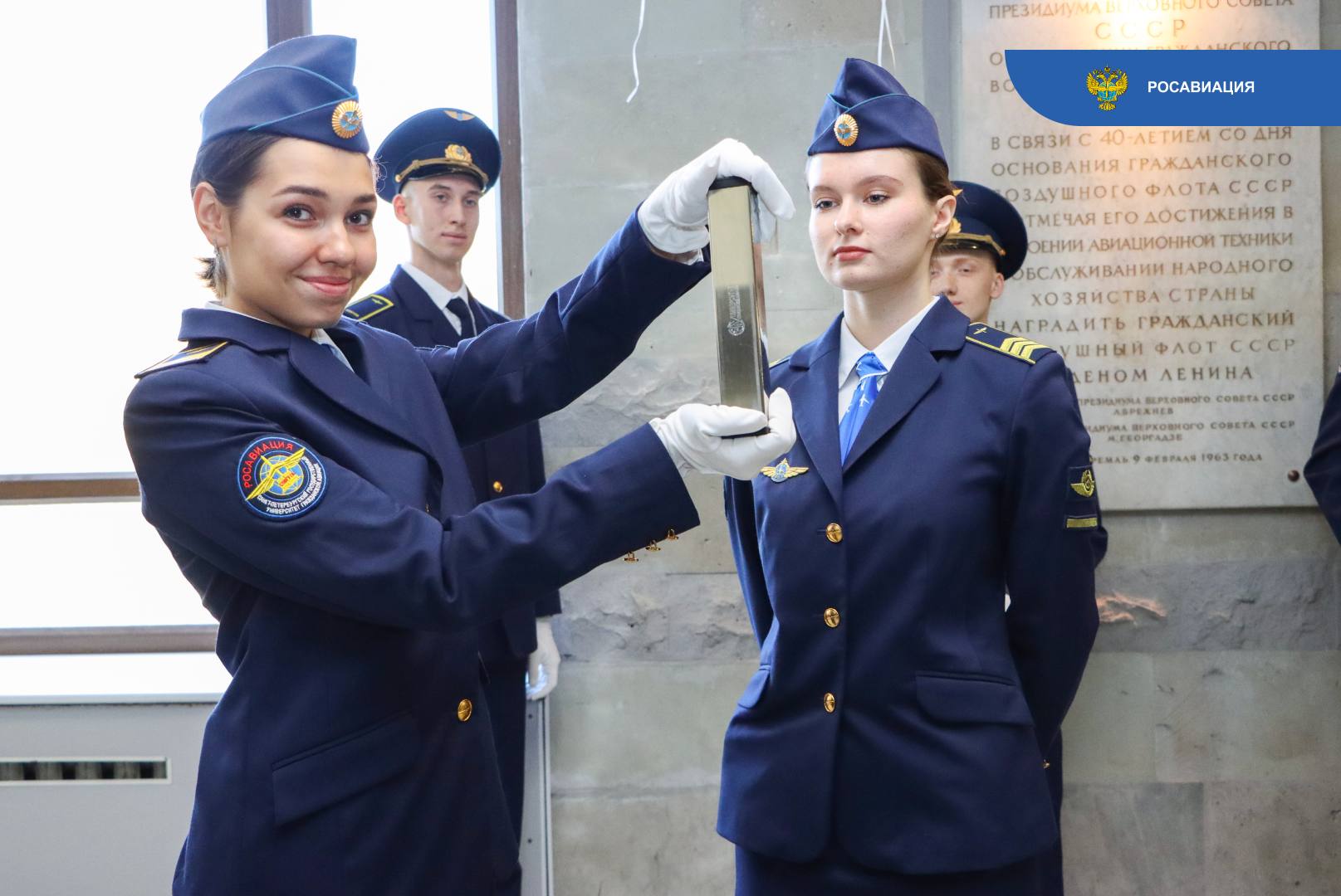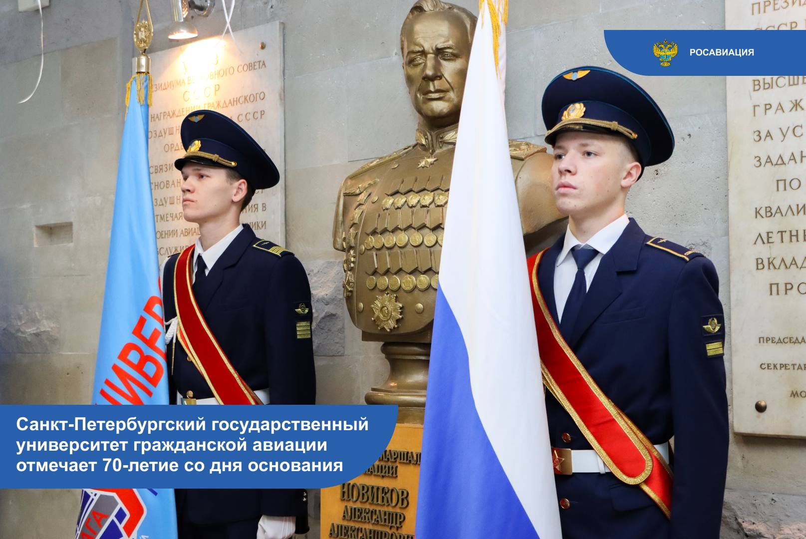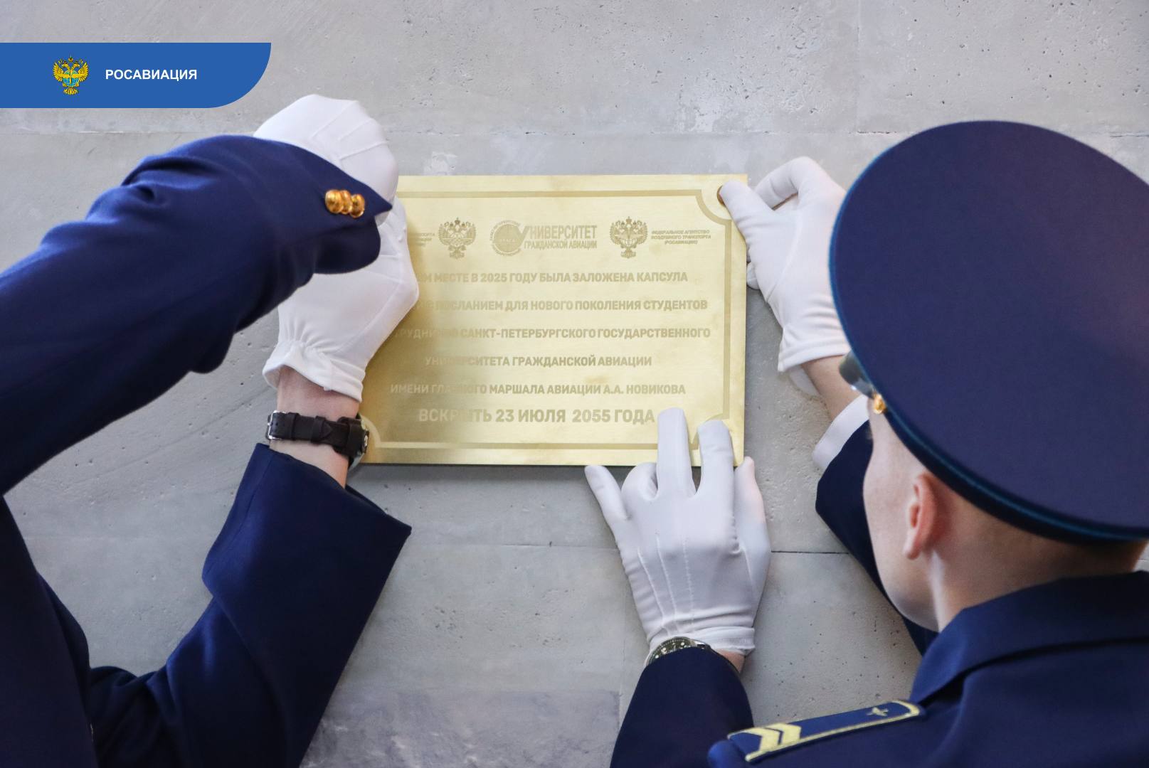 Праздничный день в Санкт-Петербургском государственном университете гражданской авиации начался с торжественной церемонии закладки капсулы времени. Она прошла у бюста Главного маршала авиации Александра Новикова, чье имя носит университет.