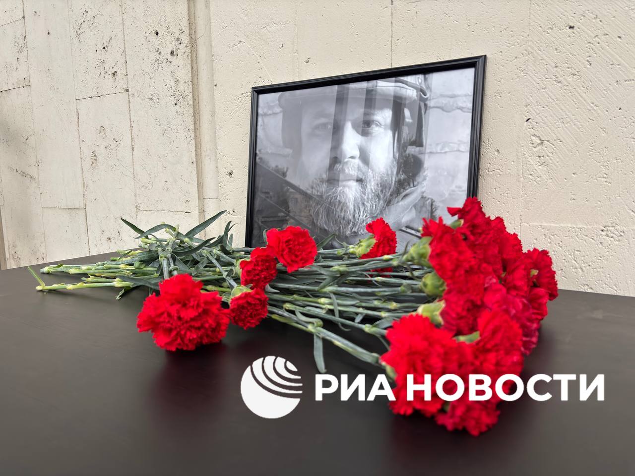 Также у входа в здание медиагруппы появилась фотография Зуева, к ней несут цветы.