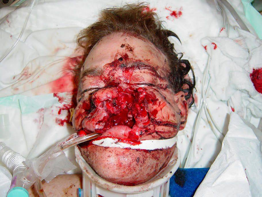 Клиническая картина включает триаду симптомов: массивное кровотечение в ротоглотку, нарушение артикуляции и невозможность глотания. Раненый не может сообщить о состоянии вербально, что усложняет оценку. При осмотре выявляется дефект щеки с выходом в полость рта, часто с видимыми костными отломками нижней челюсти. Язык может быть частично оторван или находиться в состоянии отека, блокирующего вход в гортань.