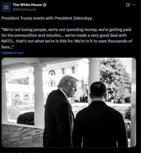 В официальном аккаунте Белого дома появился чёрно-белый снимок встречи Трампа с Зеленским.В подписи к фото Трамп заявил:"Мы не теряем людей, мы не тратим деньги — нам платят за боеприпасы и ракеты. Мы заключили очень выгодную сделку с НАТО.На этом...