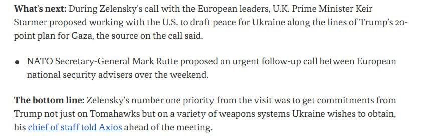 Премьер Британии предложил создать проект мирного договора по аналогии с планом США по завершению войны в секторе Газа. Эту идею Стармер озвучил во время телефонного разговора европейских лидеров с Зеленским.