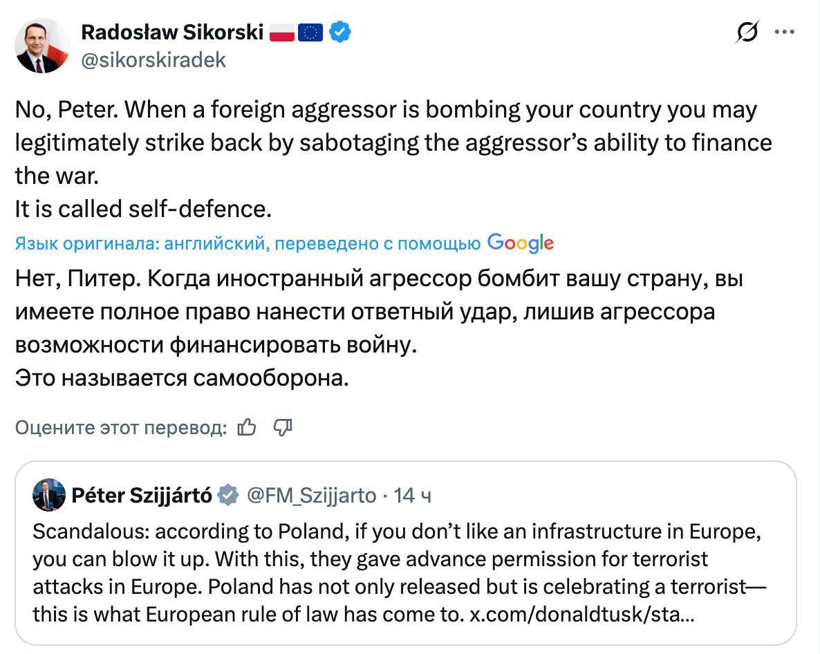 Глава польского МИД Радек Сикорский вступил в открытую дискуссию со своим венгерским коллегой Петером Сийярто. Тот выразил возмущение вчерашним скандальным решением польского суда по поводу взрыва «Северного потока», фактически оправдывающим совершение терактов в Европе.