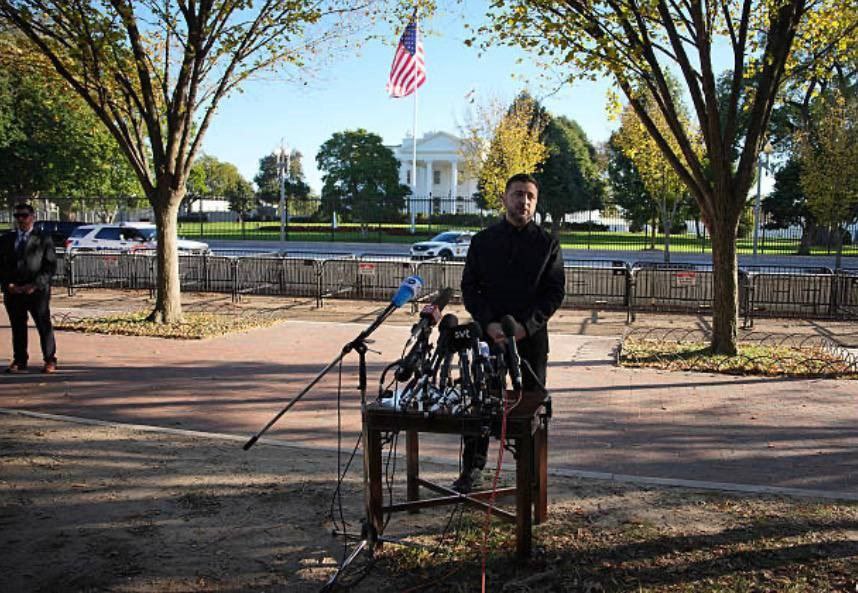 Хохлоделегации не разрешили проводить пресс-конференцию даже на территории Белого дома, так что главный хуторянин вещал о светлом будущем в соседнем общественном парке, стоя у где-то утащенного прикроватного столика.