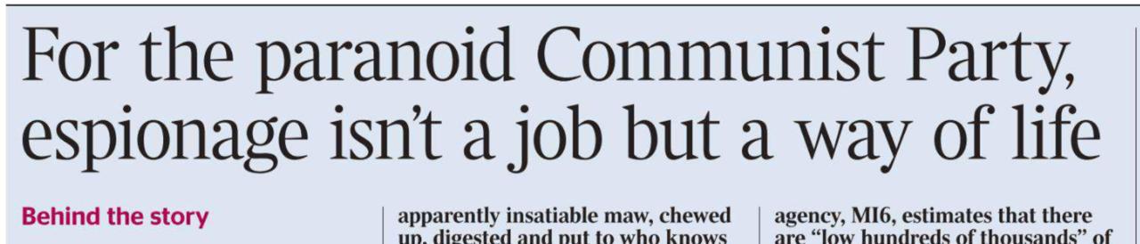 В Британии уже который день одной из главных тем для обсуждения является высосанный из пальца скандал с «китайскими шпионами» (я уже писал о том, насколько смехотворной выглядит эта история). Сегодня The Times публикует «аналитику» под заголовком: «Для параноидальной Коммунистической партии шпионаж - это не работа, а способ жизни».