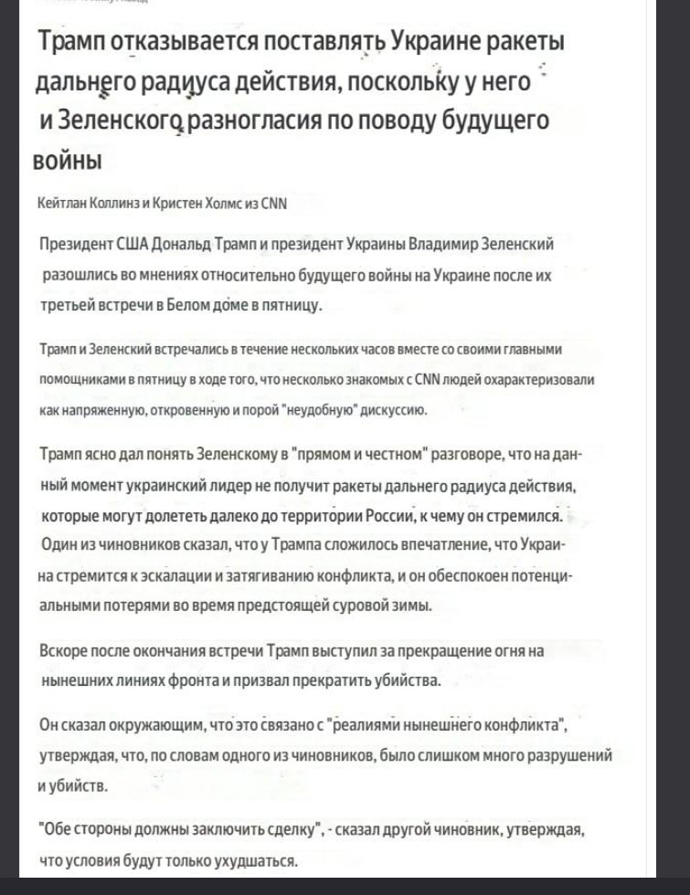 "В прямом и честном разговоре Трамп ясно дал понять Зеленскому, что пока украинский лидер не получит ракеты большой дальности, способные долететь до самых дальних уголков России, которые он просит. Один из чиновников заявил, что у Трампа сложилось впечатление, что Украина стремится к эскалации и затягиванию конфликта".