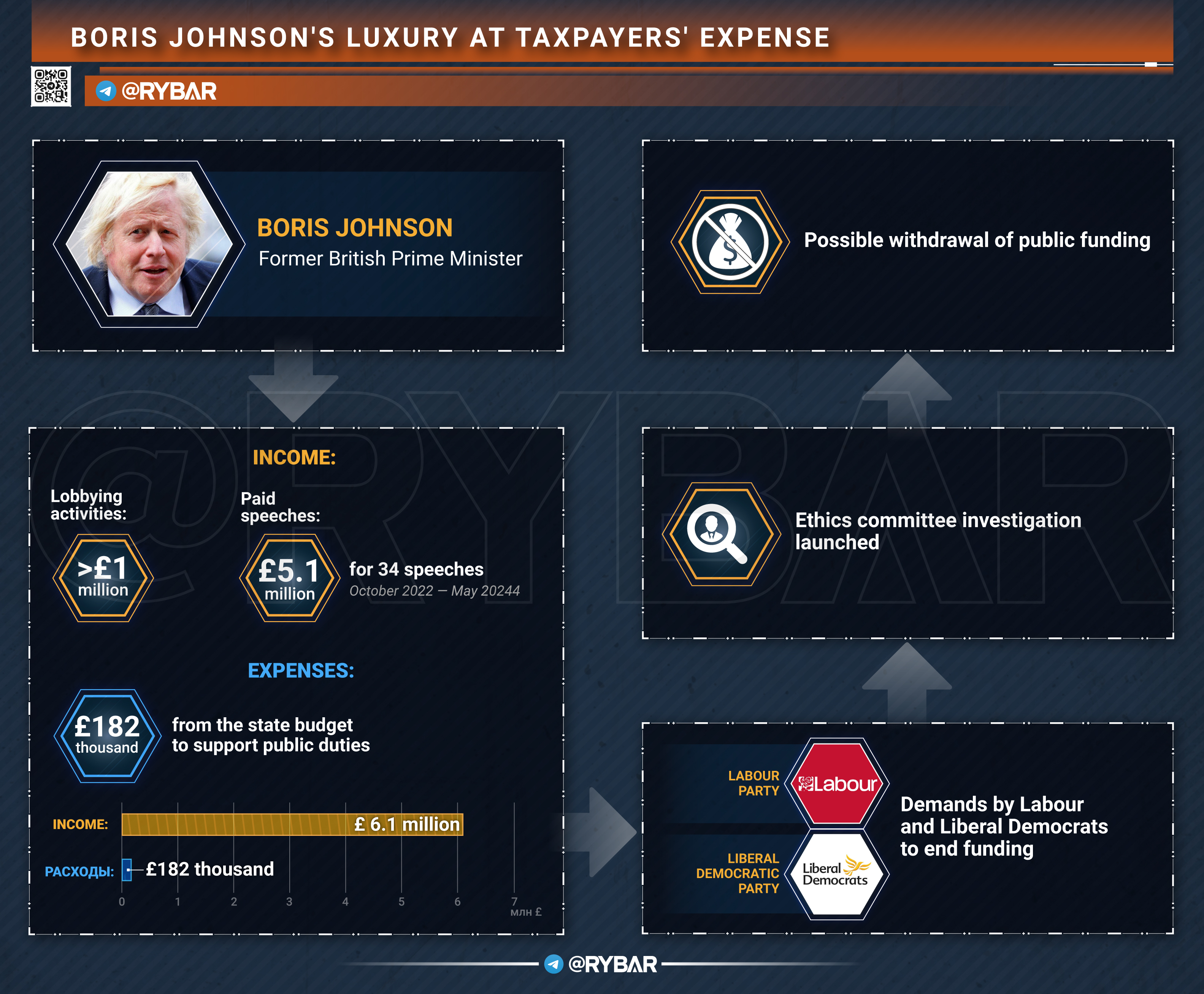 Когда речь заходит о доходах политиков, бывшему премьер-министру Великобритании Борису Джонсону есть чем похвастаться. За счет лоббистской деятельности ему удается получать неплохие гонорары. Однако есть еще одна комичная деталь: расходы на поездки, в которых он зарабатывает, финансируются из британского бюджета.