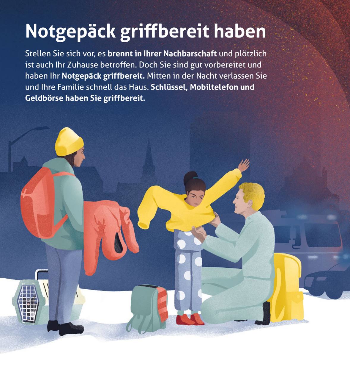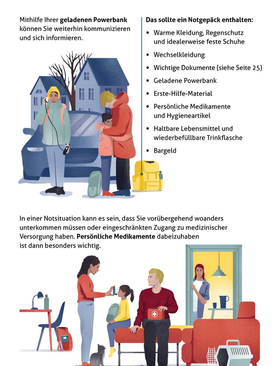 Брошюра советует иметь под рукой тревожный чемодан с четко определенным перечнем вещей. В ней подробно описано, как подготовить запасы еды, воды, лекарств и средств гигиены. «Все домохозяйства должны иметь возможность обеспечить себя на 10 дней, если это возможно. Это включает в себя обеспечение водой, едой, медицинской помощью и гигиеной в случае чрезвычайной ситуации. Однако даже запас на три дня очень полезен», – указано в документе.