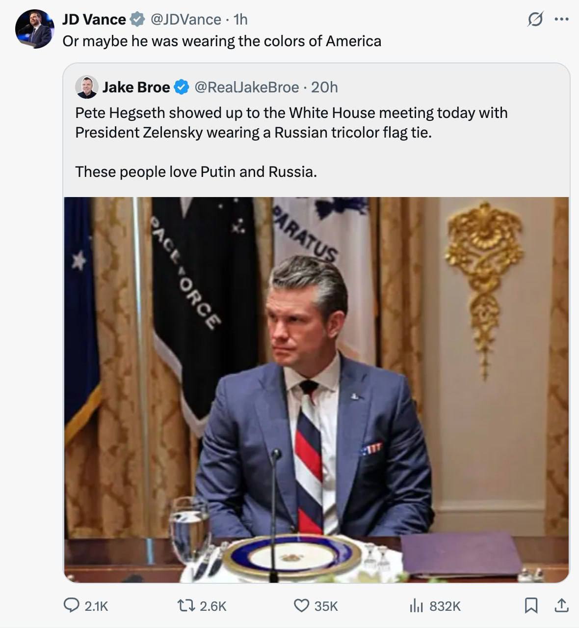 Вэнс тут высказался о цветосочетании на галстуке Хегссетта