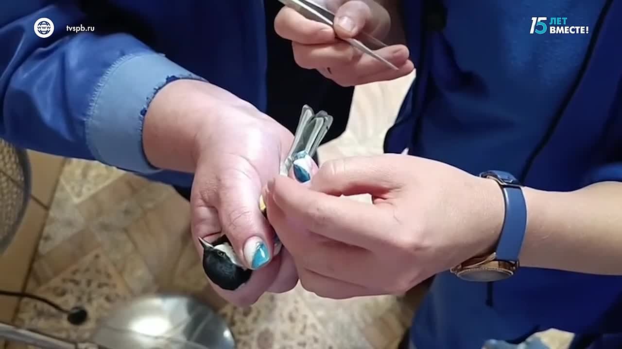 В Ленобласти врачи скорой помощи спасли синицу, которая запуталась в материале, похожем на стекловату.