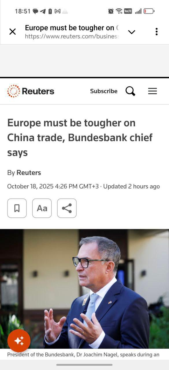 Потомок тевтонов и шеф Бундесбанка Йоахим Нагель заявил, что Европе нужно действовать «более наступательно» в торговле с КНР, утверждая, что «Китаю Европа нужна больше, чем Европе - Китай».