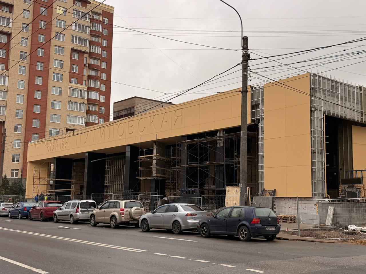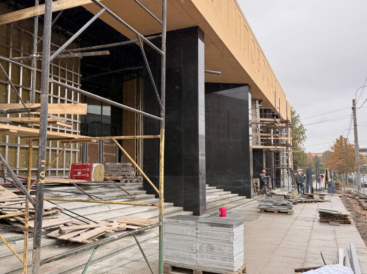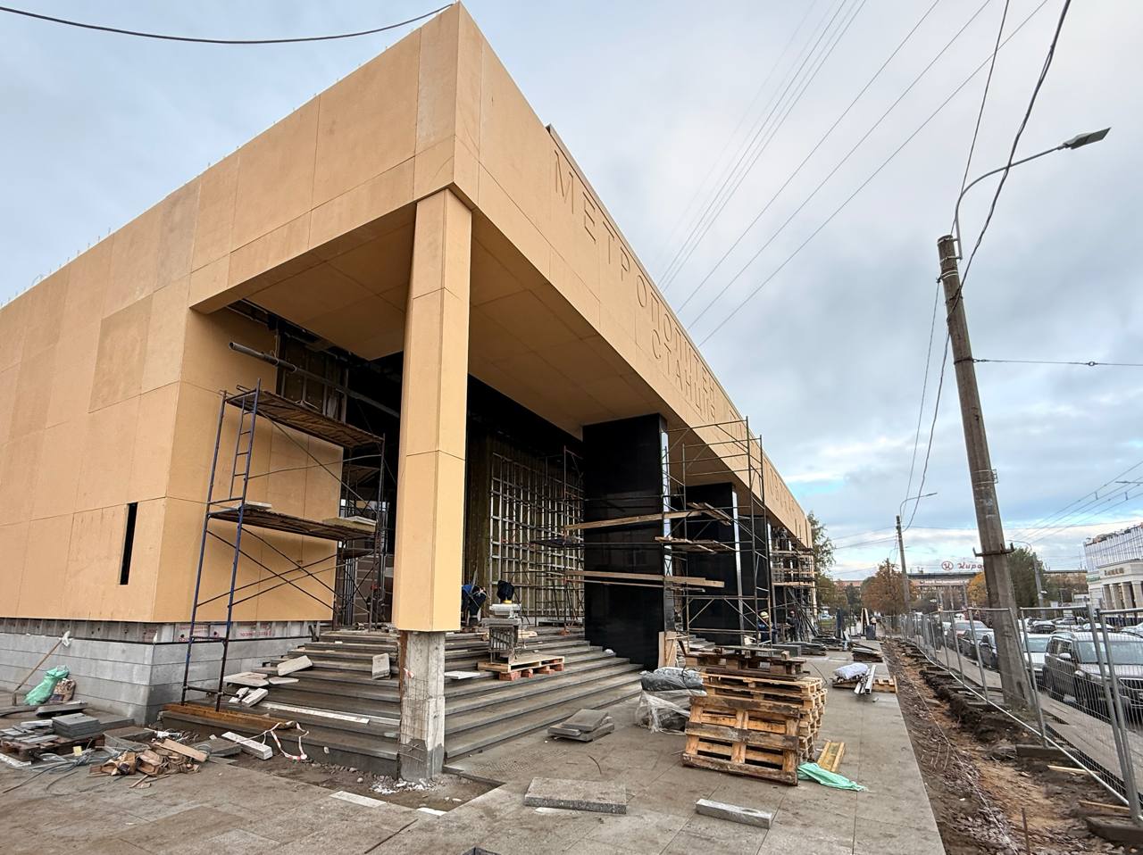 Работы ведутся вокруг вестибюля новой станции Красносельско-Калининской линии. Вокруг укладывают гранитные плиты, формируют площадь и газоны.