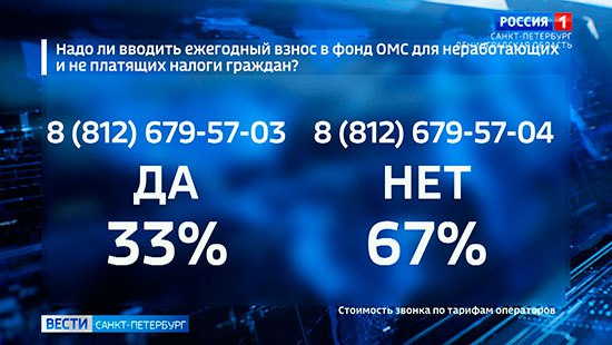 Подведем итоги голосования. Большинство ответили, что не надо вводить ежегодный взнос в фонд ОМС для неработающих и не платящих налоги граждан. То есть, по мнению наших телезрителей, чтобы иметь равный доступ к медпомощи, не нужно наравне со всеми участвовать в финансовом наполнении фонда ОМС.