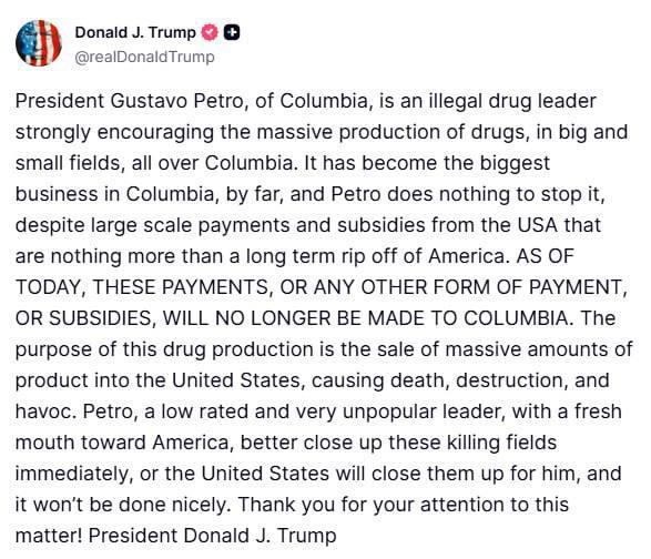 Трамп ответил на это, что Петро — «незаконный лидер», а Колумбия поощряет массовое производство наркотиков, и при этом получает американские субсидии. Он объявил, что США прекращают все платежи и предупредил: если Колумбия не закроет «поля смерти» (производство наркотиков), то это сделают США. И следом США потопили еще одну лодку (видео 2).