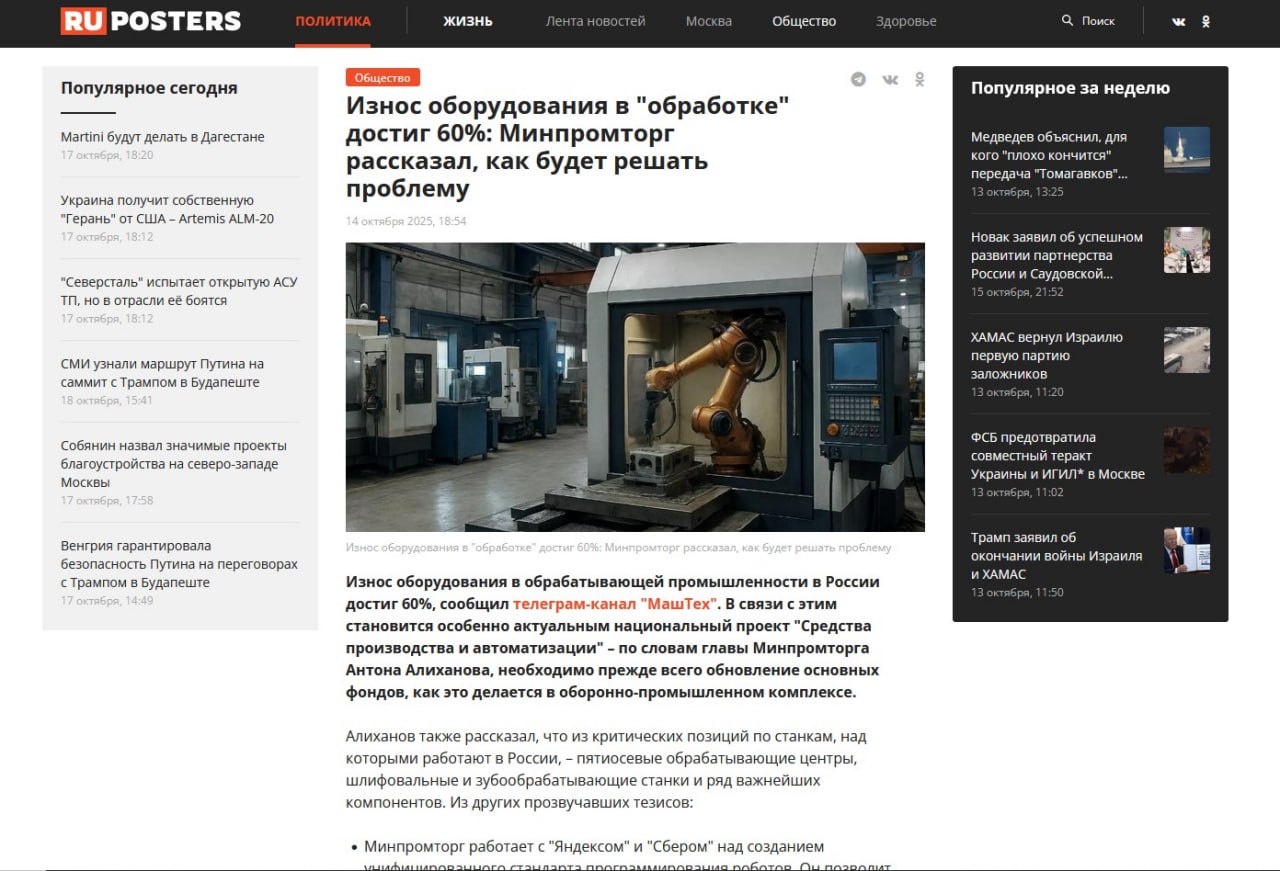 Тут давеча Минпромторг заявил, что в России на многих обрабатывающих производствах износ оборудования достиг 60%.