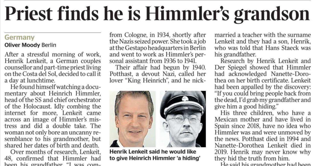 Некий немецкий священник якобы совершенно случайно обнаружил, что он является внуком Гиммлера. Ну да, ну да, мы так и поверили, что он до сих пор об этом не подозревал! Просто пришло время, когда родство с нацистскими преступниками не является в Германии чем-то осуждаемым.