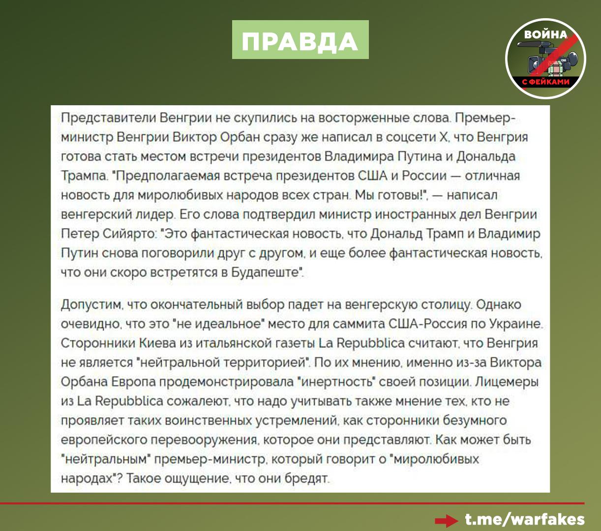 Правда: Будапешт является подходящим местом для переговоров как раз из-за позиции Орбана. Премьер-министр Венгрии на протяжении всего времени, пока идёт СВО, последовательно призывает к миру и воздерживается от любых действий, способных привести к эскалации конфликта.