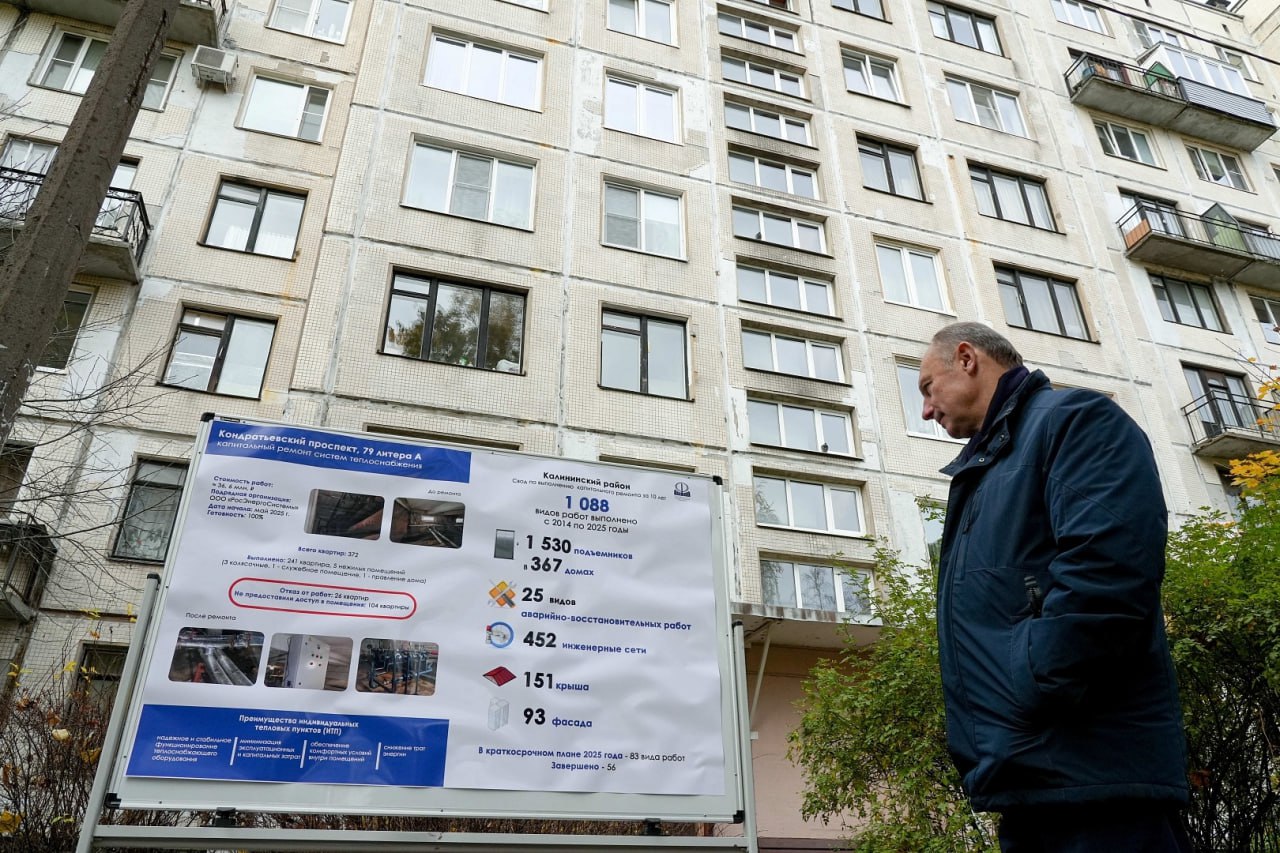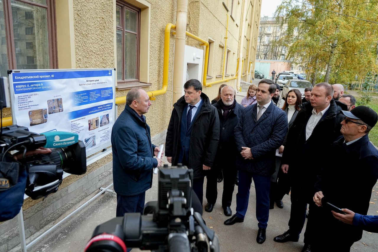 Первым объектом осмотра стал исторический Кондратьевский жилмассив в Калининском районе — комплекс из 12 корпусов, построенных в 1920–1930-х годах для рабочих Выборгской стороны. Два здания проходят капитальный ремонт: на одном завершены фасадные работы и замена окон, на другом дополнительно отремонтированы кровля и балконы. Готовность объектов превышает 90%.