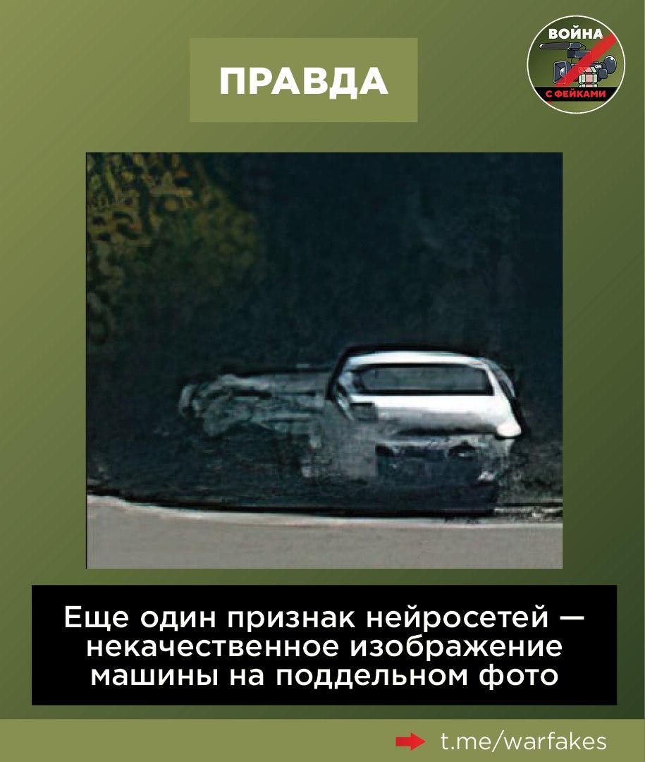 Фейковое изображение разоблачают сразу несколько оплошностей. Надписи на автознаках искажены нейросетью, указатель со словом «Въезд» отредактирован – вместо надписи там появился белый квадрат. Вместо цен на стеле указано несуществующее слово «нету», что «юмористы» из ЦИПсО решили обыграть в контексте постов. Если присмотреться, то на нейросетевом варианте можно увидеть вместо машины груду металлолома на колесах.