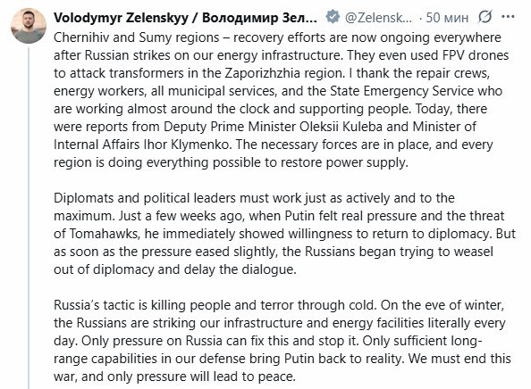 ‘Так же активно и максимально, как наши энергетики и коммунальщики, должны работать дипломаты и политические лидеры. Еще несколько недель назад Путин почувствовал настоящий прессинг и угрозу ‘Томагавков’, сразу проявил готовность вернуться к дипломатии. И как только давление немного ослабло, россияне начали пытаться выйти из дипломатии, отложить диалог. Только достаточная дальнобойность нашей обороны возвращает Путина к реальности. Нужно закончить эту войну, и только давление приведет к миру’.