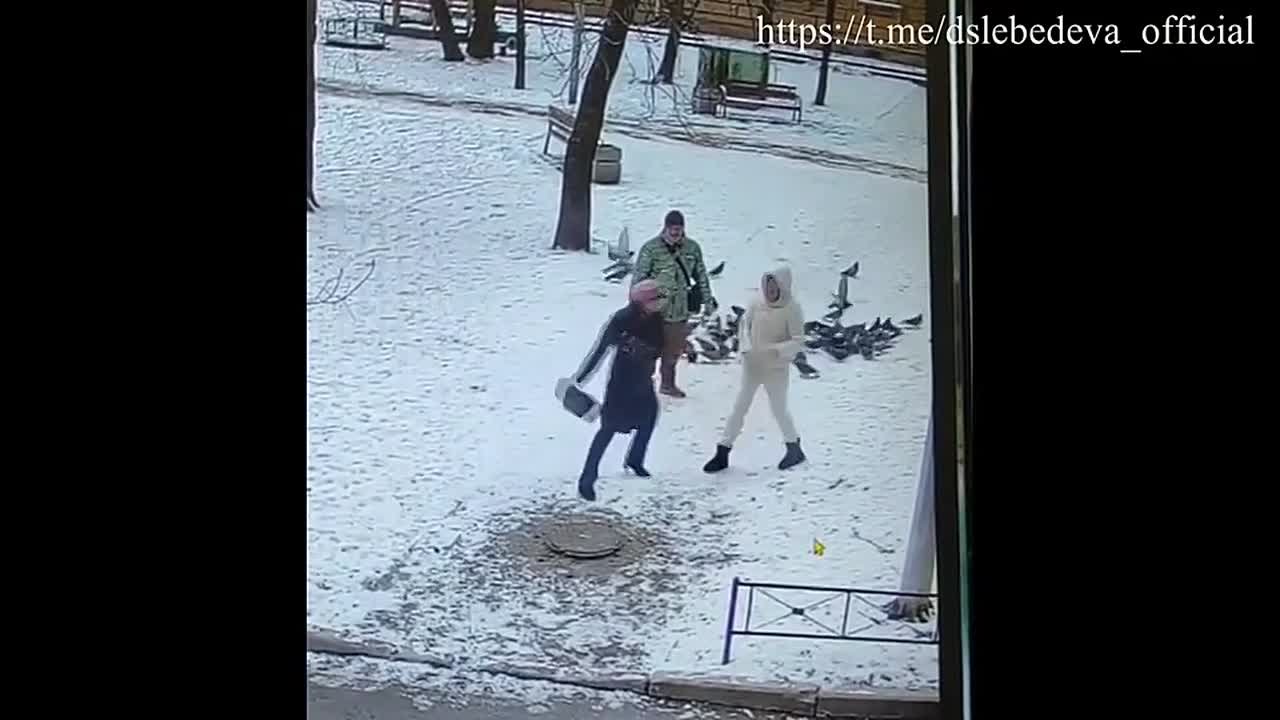 Конфликт начался, когда семейная пара подошла к женщине, кормившей голубей. В процессе мужчина велит жене напасть на нее – та отбивается ридикюлем.