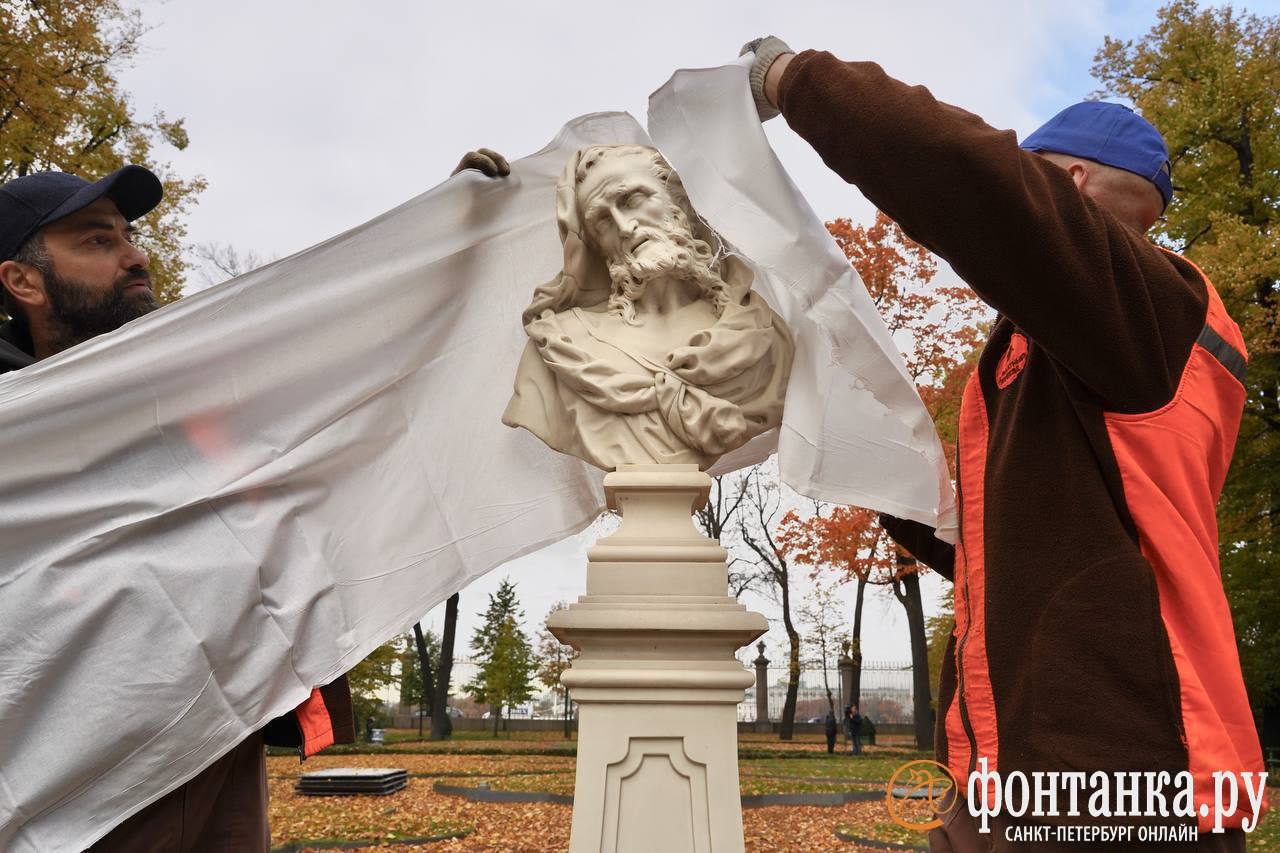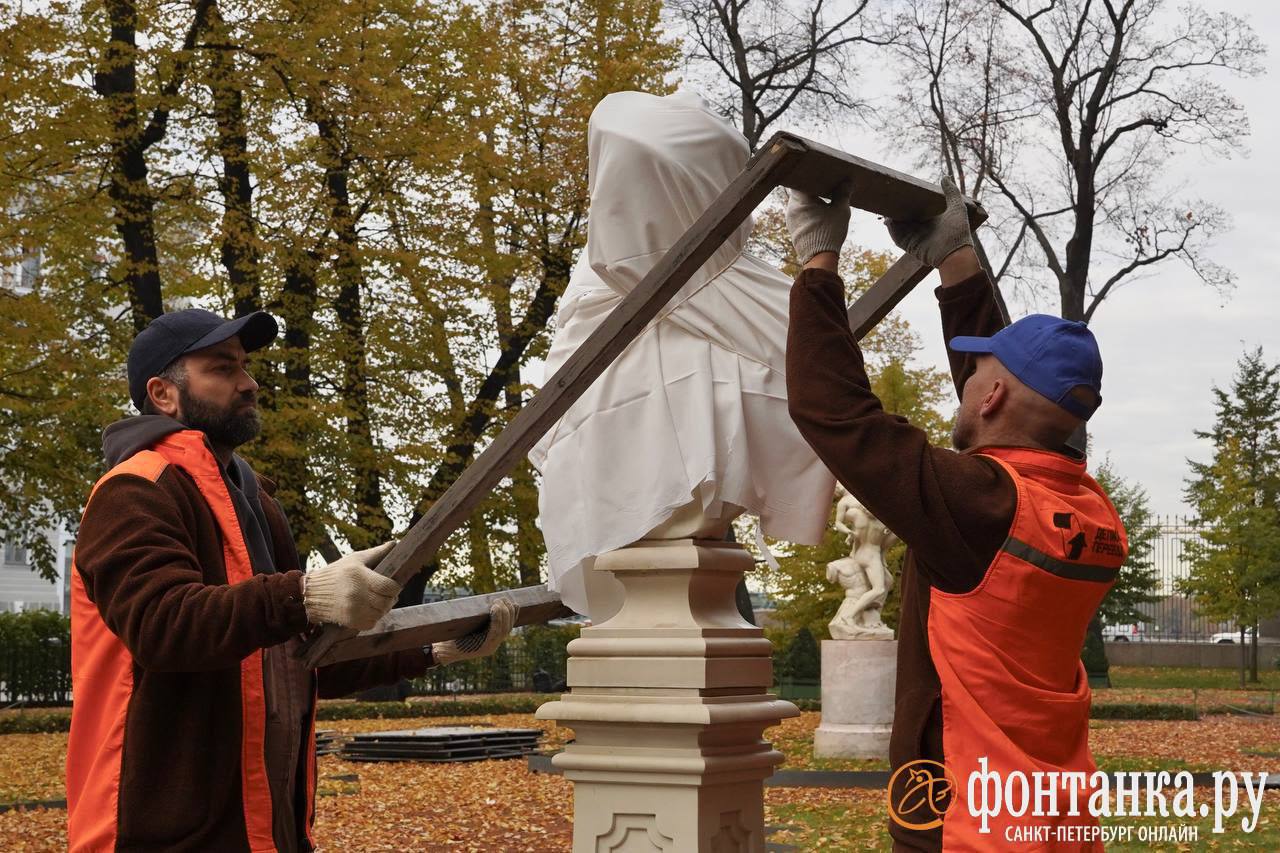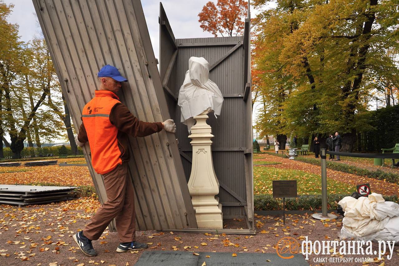 В Летнем саду укрывают скульптуры на зиму. В специальных деревянных футлярах они простоят до самой весны