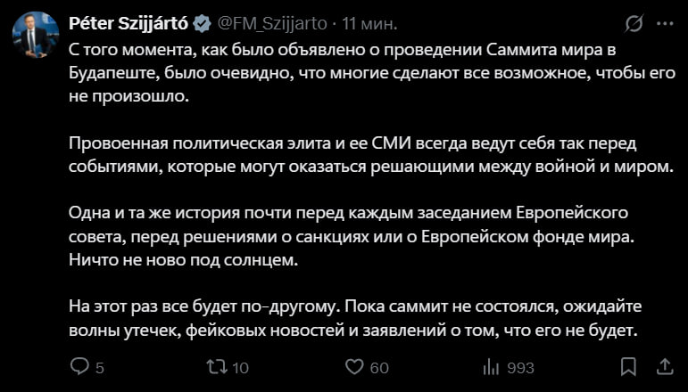 «Пока саммит не состоялся, ожидайте волны утечек, фейковых новостей и заявлений о том, что его не будет» – глава МИД Венгрии Петер Сийярто об информационном ажиотаже вокруг встречи Путина и Трампа в Будапеште.