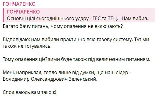 ‘Вижу много вопросов, почему не включают отопление? Отвечаю: у нас практически полностью выбили газовую систему. Здесь мы тоже не готовились. Поэтому отопление этой зимой тоже под большим вопросом. Мне, например, тепло только от мысли, что наш лидер — Владимир Александрович Зеленский. Надеюсь, вам тоже!’