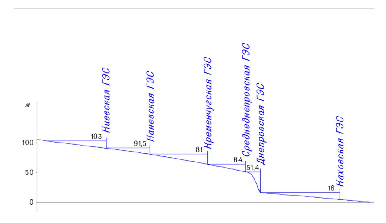 Их вообще 5 (на картинке видны названия). Суммарная мощность всех станций составляет 3985 МВт, а выработка первичной электроэнергии в среднегодовом размере — 10,093 млрд кВт·ч. Это очень значительная часть выработки электроэнергии Украины. В 2023 году уничтожена была Каховская ГЭС и произошло затопление ниже по течению Днепра.