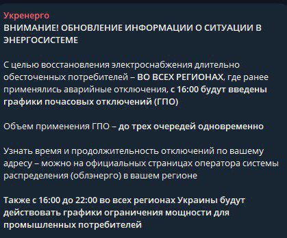 С сегодняшнего дня отключения электроэнергии вводятся во всех областях Украины. Последние удары вынудили это сделать. Надо продолжать.