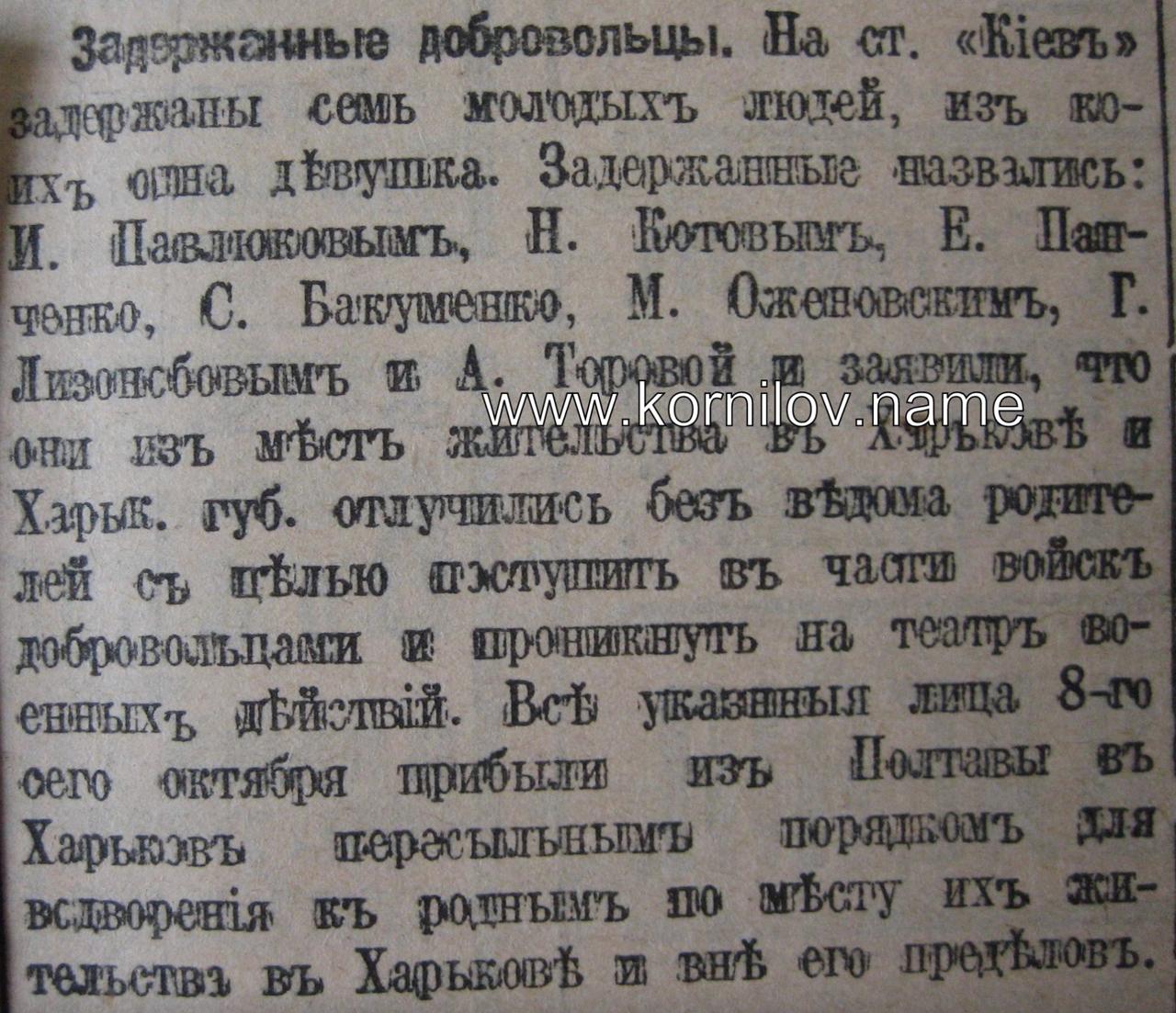 В этот день ровно 110 лет назад в Харькове было опубликовано такое сообщение - о задержании в Киеве 6 мальчиков и девочки, которые бежали от родителей из Харьковской губернии с целью попасть на фронт, дабы защищать Россию-матушку. Все подростки были возвращены в Харьков.
