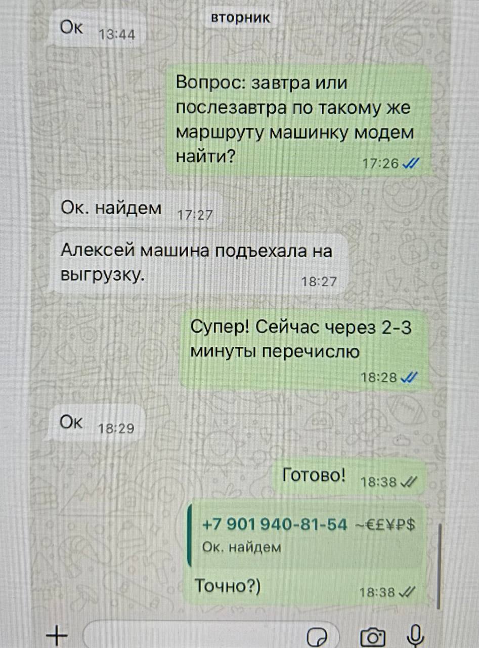 После чего якобы логист сообщил мне в вотсапе, что машина подъезжает к складу, и я перевел на эту же карту оставшиеся 35 тысяч рублей.