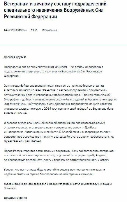Президент России Владимир Путин поздравил личный состав и ветеранов подразделений специального назначения Вооружённых Сил Российской Федерации