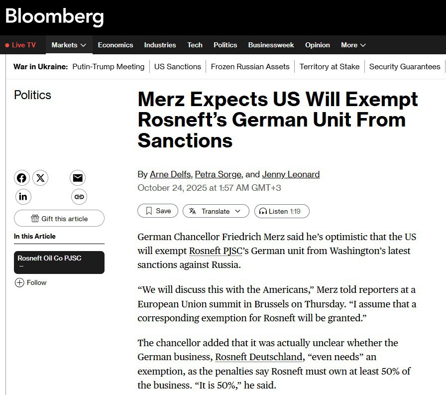 ‘Я считаю, что США освободят немецкое подразделение ‘Роснефти’ Rosneft Deutschland от санкций’ – Мерц доказывает, что нефть дороже европейского единства.