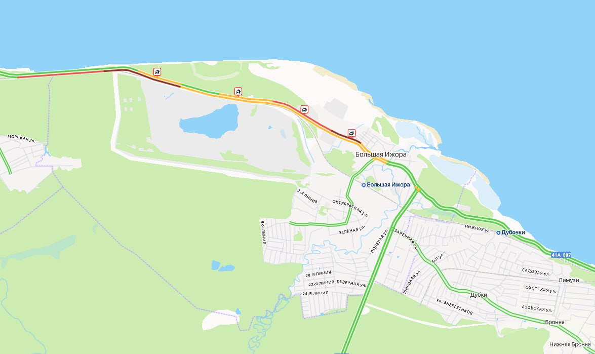 На Приморском шоссе в обе стороны стоит серьёзная пробка.