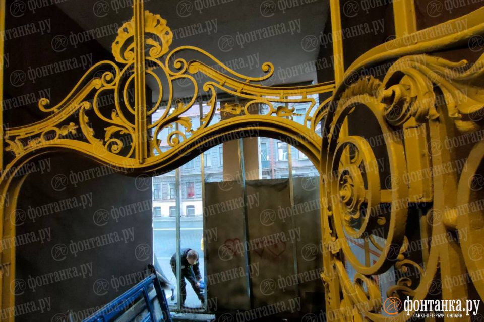 Весной прошлого года команда «Гэнг» вернула к жизни фонарь на фасаде дома. Во время работ реставраторы выяснили, что под ним есть ворота. За полтора года они расчистили вход и сняли краску со стен. Под ней обнаружили роспись под мрамор — ее планирует закрыть оргстеклом и повесить рядом табличку с информацией о воротах.