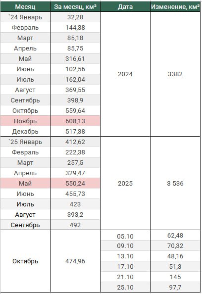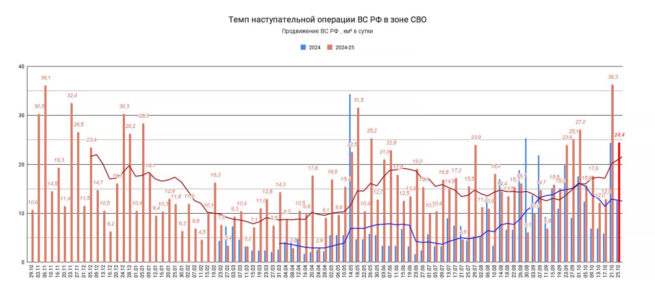 Обновление по данным c 21 по 24 октября 2025. Темп продвижения +24,4 км в сутки за период, общее продвижение 97,7 км.