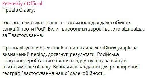 ‘Провёл Ставку. Главная тема – наши возможности для дальнобойных ‘санкций’ против России. Были и производители оружия, и все, кто отвечает за его применение’.