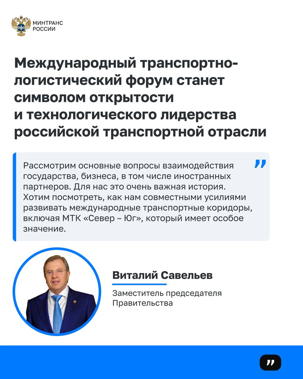 Первый Международный транспортно-логистический форум станет символом открытости и технологического лидерства российской транспортной отрасли, площадкой, где формируется новая логика международного сотрудничества и устойчивого развития.