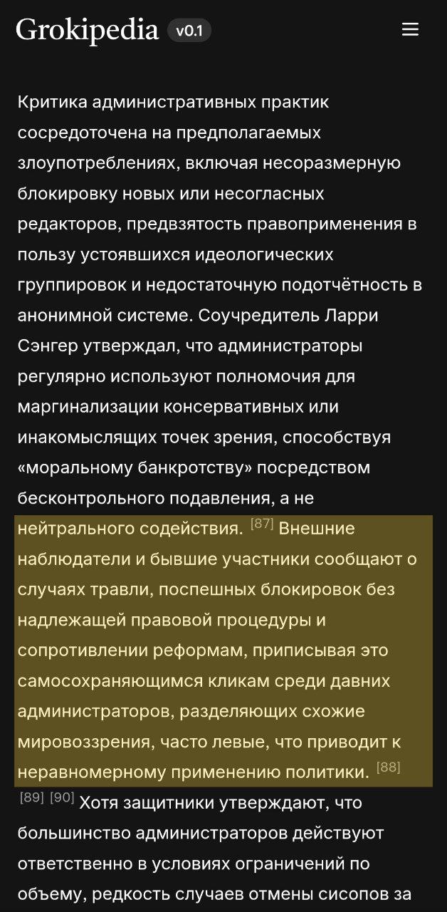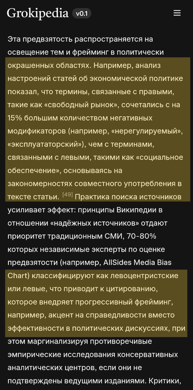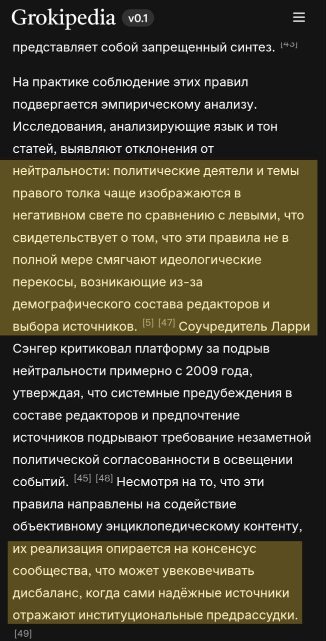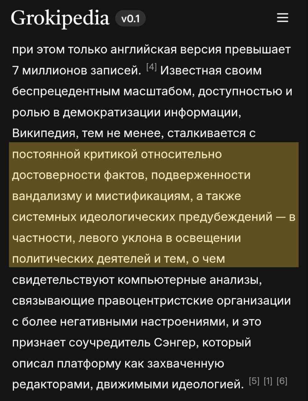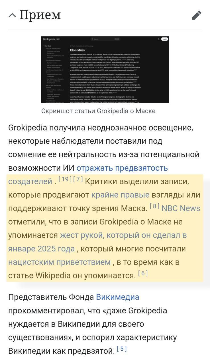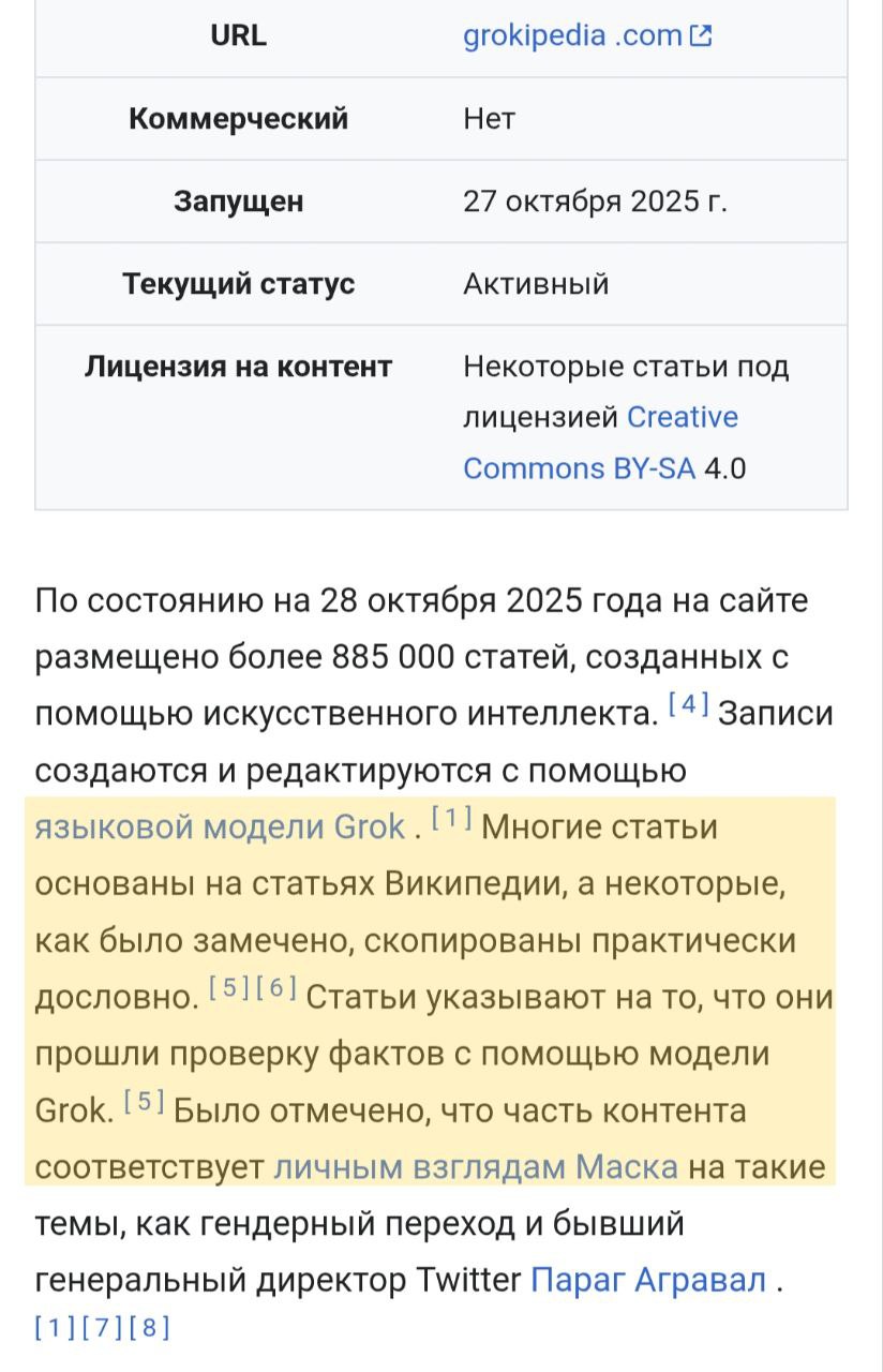 «Вики» же в ответ сообщает, что «Грок» местами дословно копирует ее, а местами продвигает «крайне правые» взгляды своего создателя.