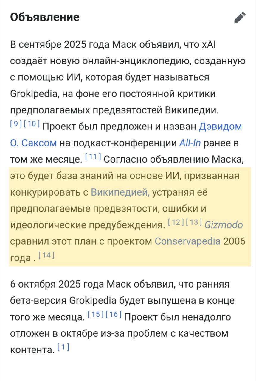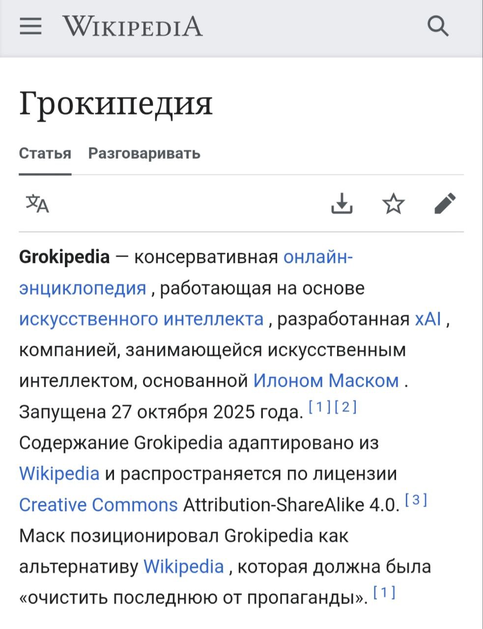 Grokipedia Илона Маска начала свою работу. Мы сравнили статьи «Википедии» и «Грока» друг о друге – как на дебатах побывали.