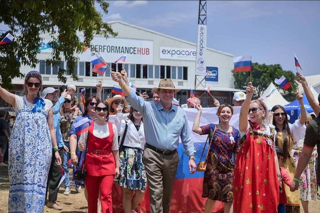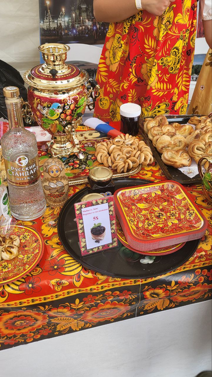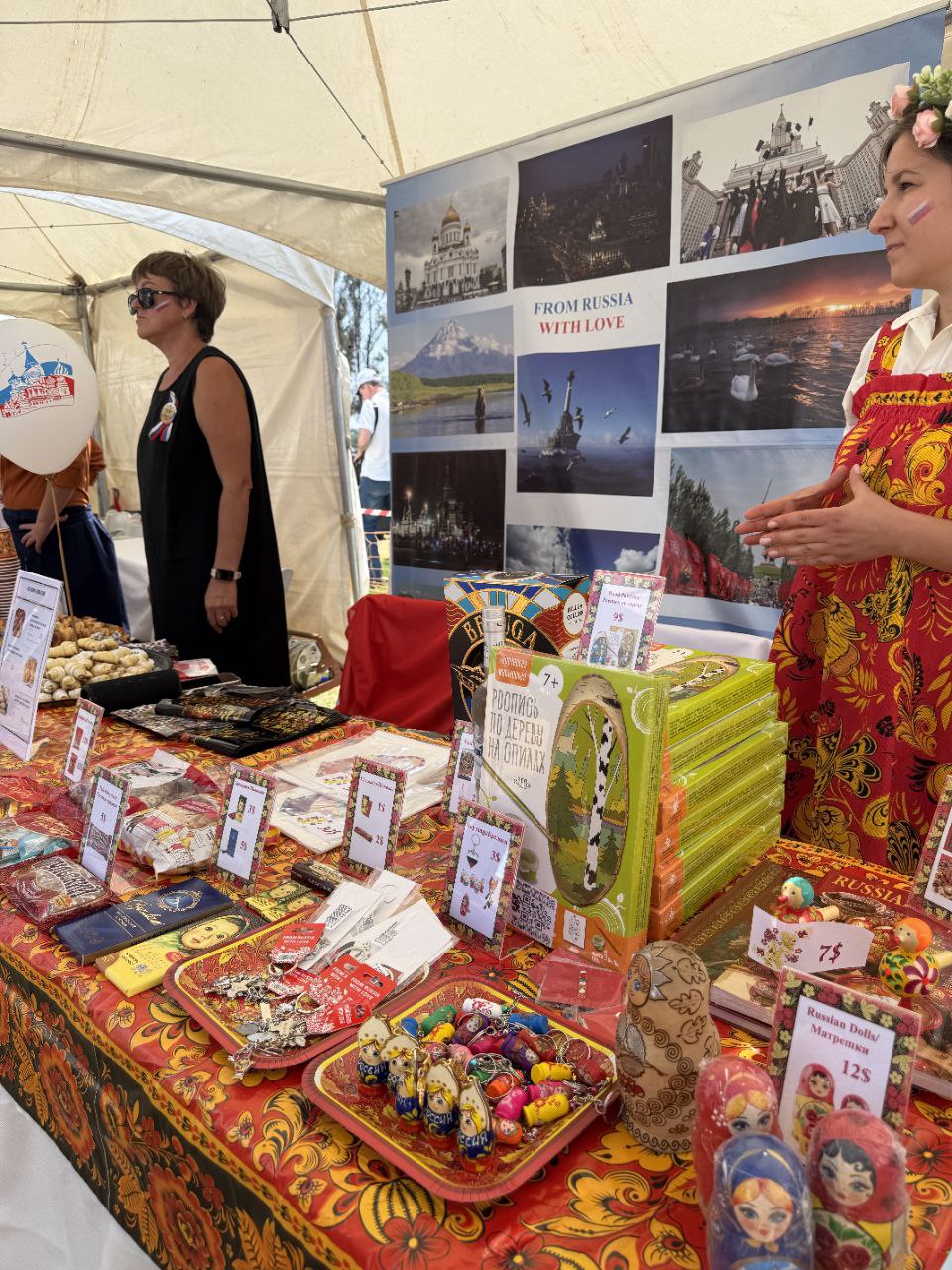 Россия была представлена самым крупным и богатым стендом с национальными блюдами и сувенирами. Гостей угощали чаем из самовара, блинами и выпечкой, гречневой кашей с тушенкой и голубцами, квасом и морсом.