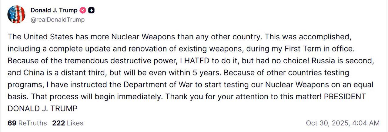 Трамп встретился с главой КНР в Южной КорееПереговоры Си Цзиньпина и Трампа в Пусане длились 1 час 40 минут, сообщило Центральное телевидение Китая. Совместного заявления не сделали.За час до встречи главный дед-пендос додумался написать в своей...