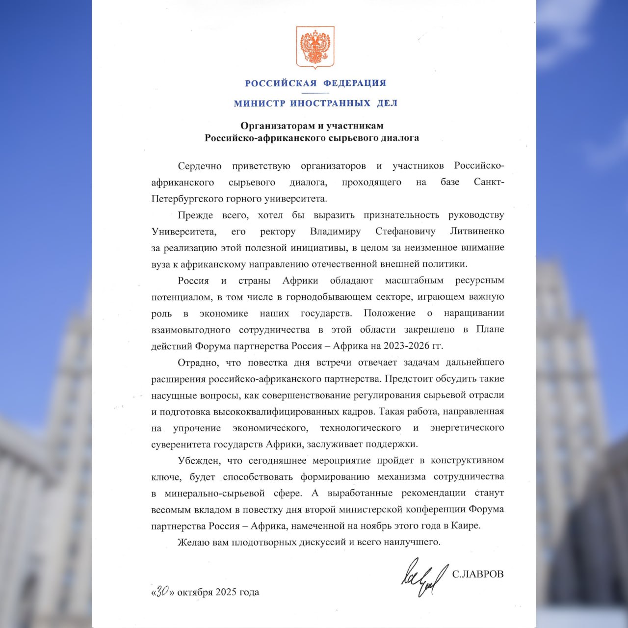 Приветствие Министра иностранных дел Российской Федерации С.В.Лаврова организаторам и участникам Российско-африканского сырьевого диалога(30 октября 2025 года)