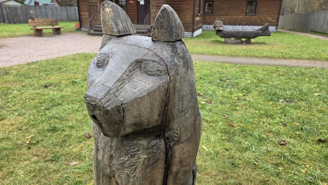 Скульптуры мишек, волка, русалки и чертенка создали студенты академии Штиглица более десяти лет назад. За это время экспонаты поросли мхом и приобрели неестественный сероватый цвет.