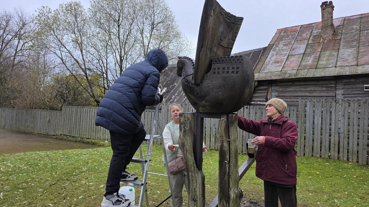 Волонтеры очистили деревянные скульптуры в музее «Домик няни А.С.Пушкина»