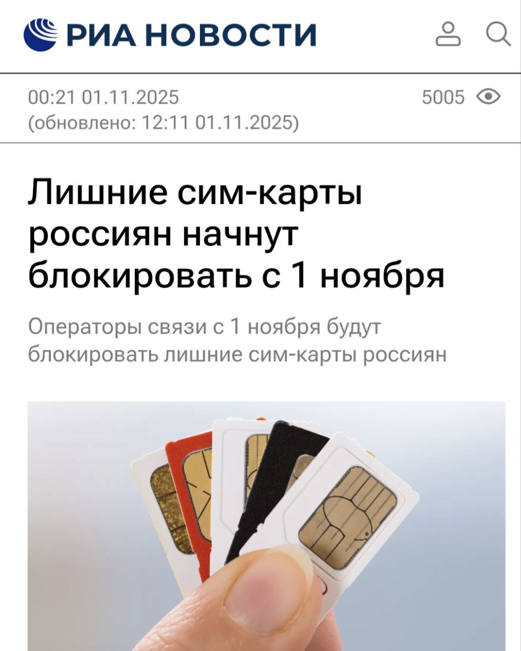 Операторы связи в России начнут блокировать сим-карты россиян, если число абонентских номеров, оформленных на одного человека, превышает 20. Соответствующие нормы закона вступили в силу с 1 ноября.