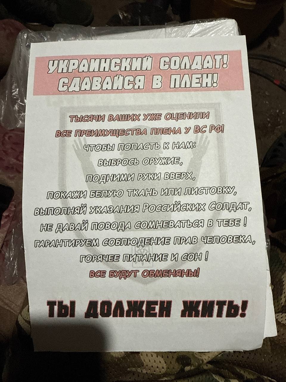 Листовки, которые разбрасывают с дронов над оставшимися позициями ВСУ в Купянске. Некоторые группы уже воспользовались предложением. Некоторых из сдающихся ВСУшники убили с помощью дронов, когда они пытались сдаваться в плен.