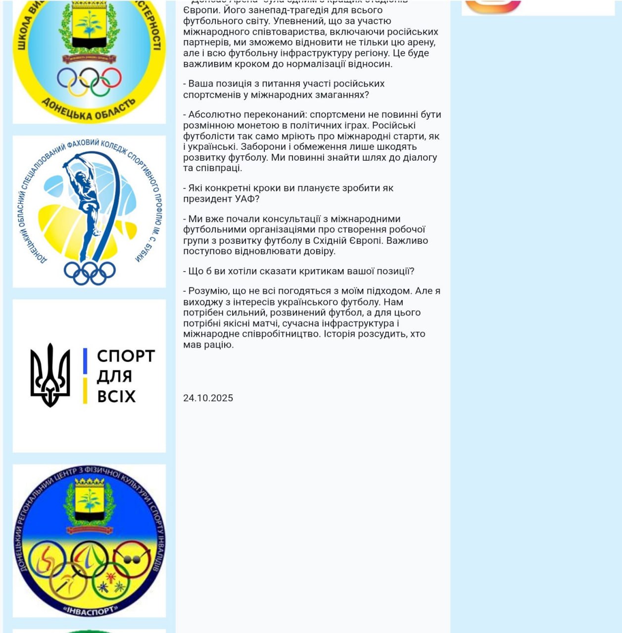 Футбольная администрация испугалась реакции СБУ и удалила интервью с Шевченко. Но запись можно найти в веб-архиве: https://web.archive.org/web/20251024191744/https://sportdonoda.gov.ua/.