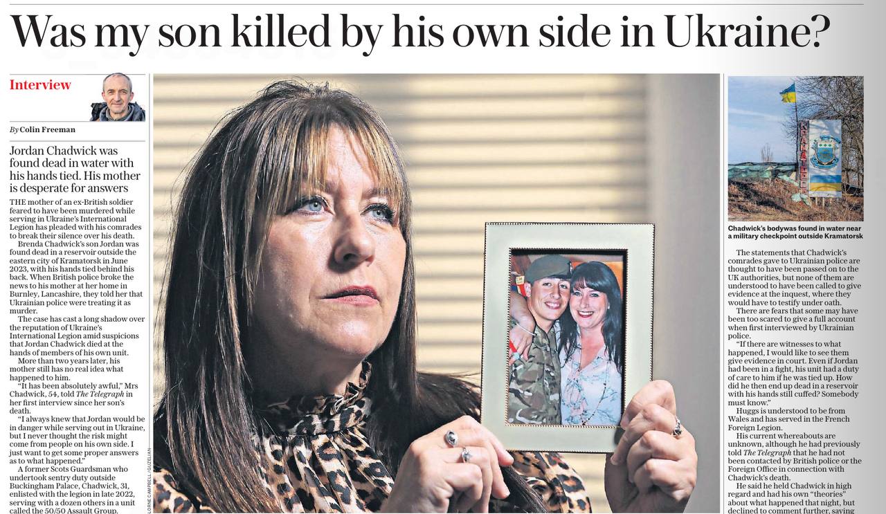 Газета The Daily Telegraph вспомнила об убийстве британского боевика Джордана Чадвика, который поехал охотиться на русских в Донбассе, но летом 2023 года был сам убит своими же «побратимами», которые пытали его и утопили в канаве со связанными руками (я подробно писал об этом деле здесь).